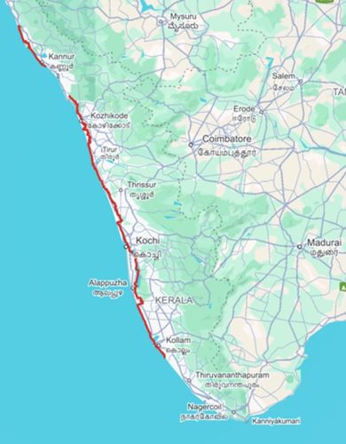 A shorter but spectacular final day. Follow the Kollam Canal to Paravur Lake, then pedal through Maniyam Kulam Canal and Edava Nadayara Kayal to reach the sea. The final stretch hugs the coast — turquoise waters on one side, red cliffs on the other — leading you to Varkala, Kerala’s cliff-top beach paradise.