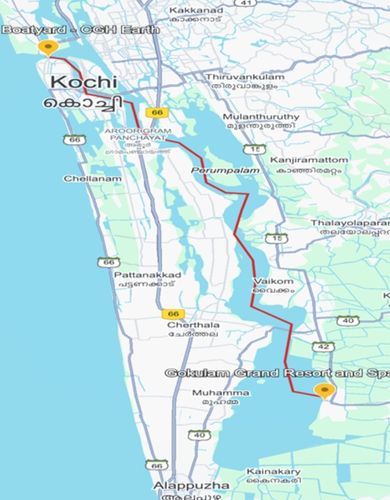 Follow the Periyar River, Kerala’s lifeline. Your final approach is via the scenic Kollam–Kottapuram Waterway, leading you right into the heart of Cochin.